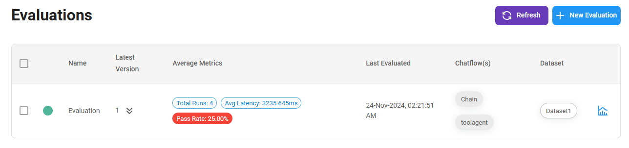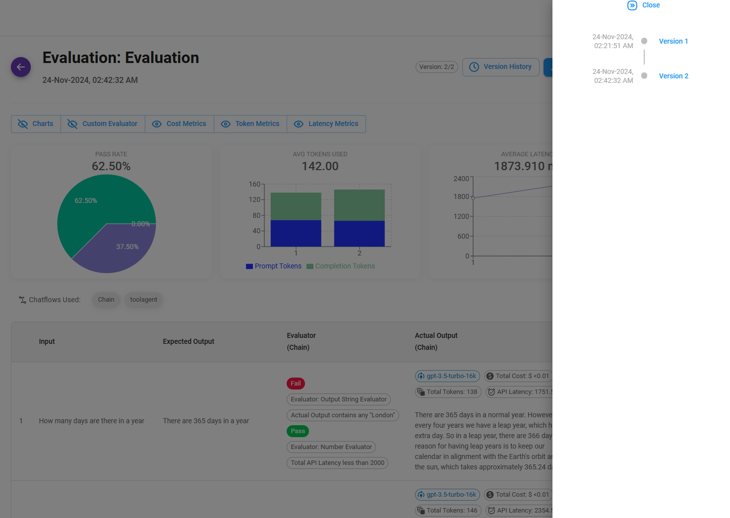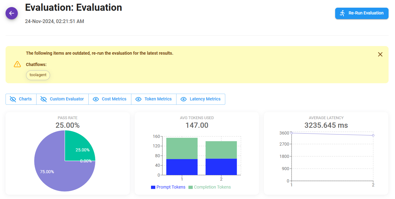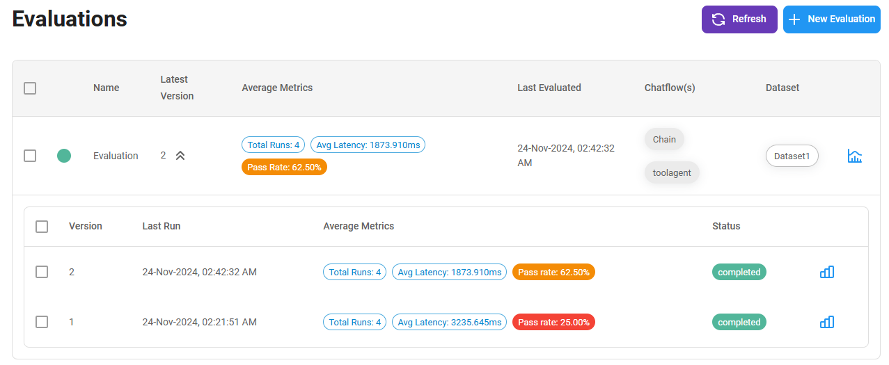 You can re-run the same evaluation using the Re-Run Evaluation button at the top right corner. You will be able to see the different versions:
