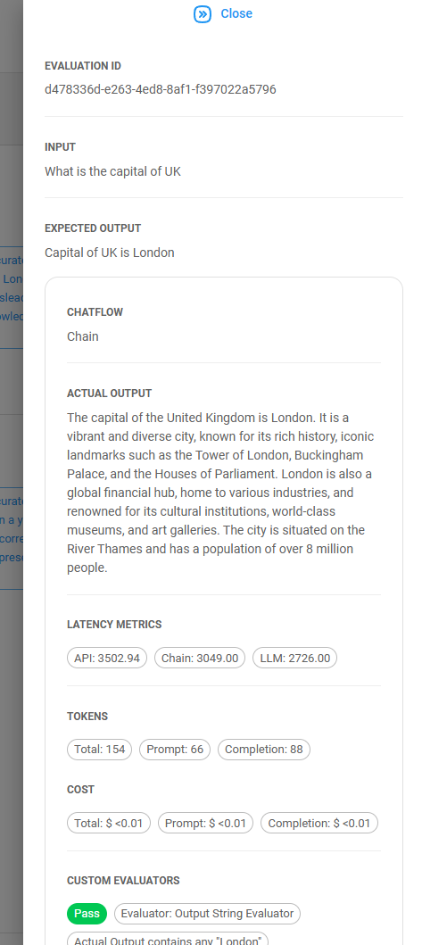 Evaluations help you monitor and understand the performance of your Chatflow/Agentflow application. On the high level, an evaluation is a process that takes a set of inputs and corresponding outputs from your Chatflow/Agentflow, and generates scores. These scores can be derived by comparing outputs to reference results, such as through string matching, numeric comparison, or even leveraging an LLM as a judge. These evaluations are conducted using Datasets and Evaluators.