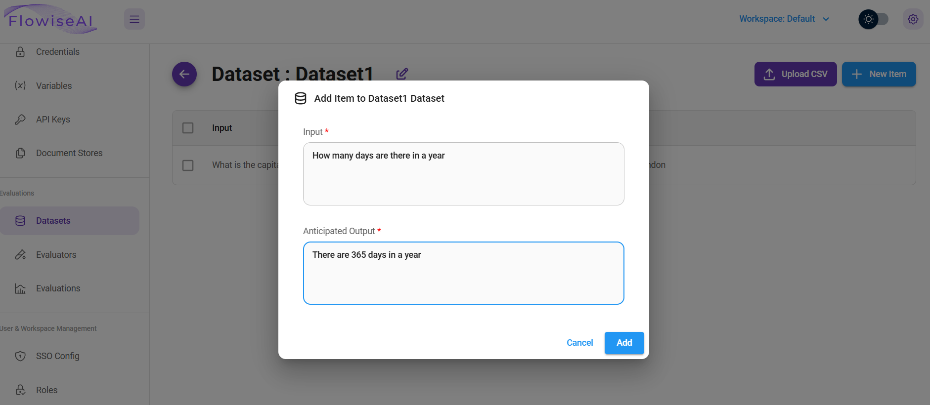 Datasets are the inputs that will be used to run your Chatflow/Agentflow, along with the corresponding outputs for comparison. User can add the input and anticipated output manually, or upload a CSV file with 2 columns: Input and Output.