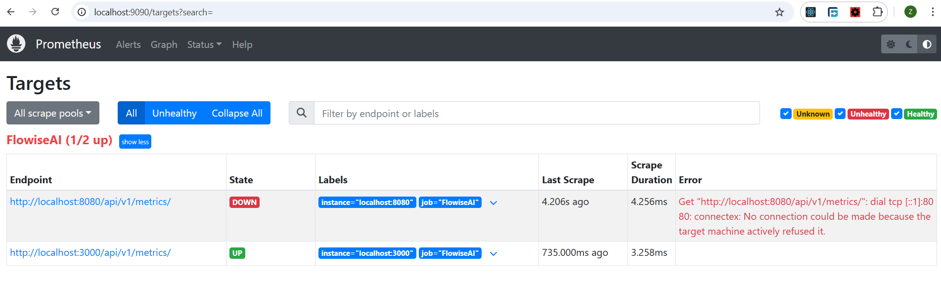 Remember to have Flowise instance also running. You can open browser and navigate to port 9090. From the dashboard, you should be able to see the metric endpoint - /api/v1/metrics is now live.