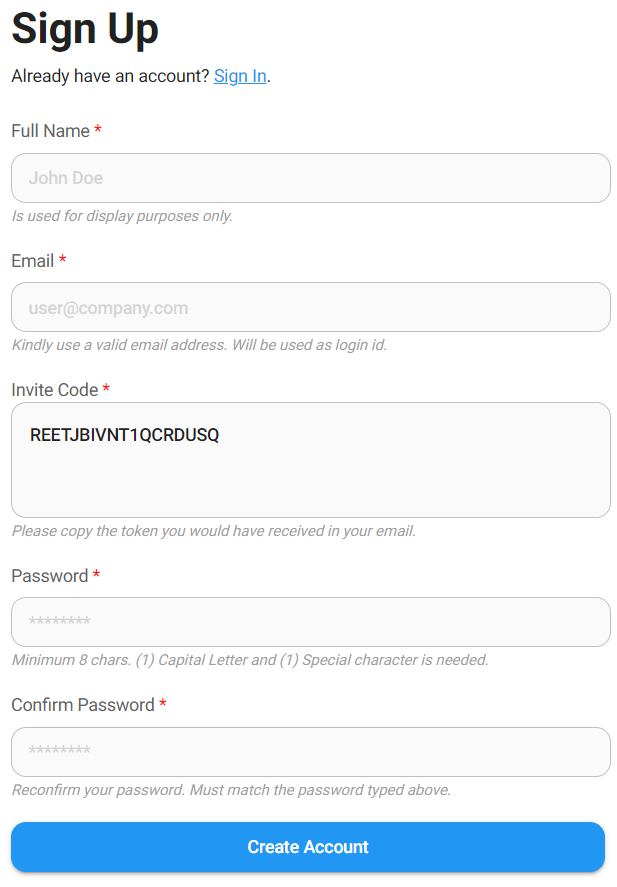 Upon clicking the invitation link, invited user will be brought to a Sign Up page.