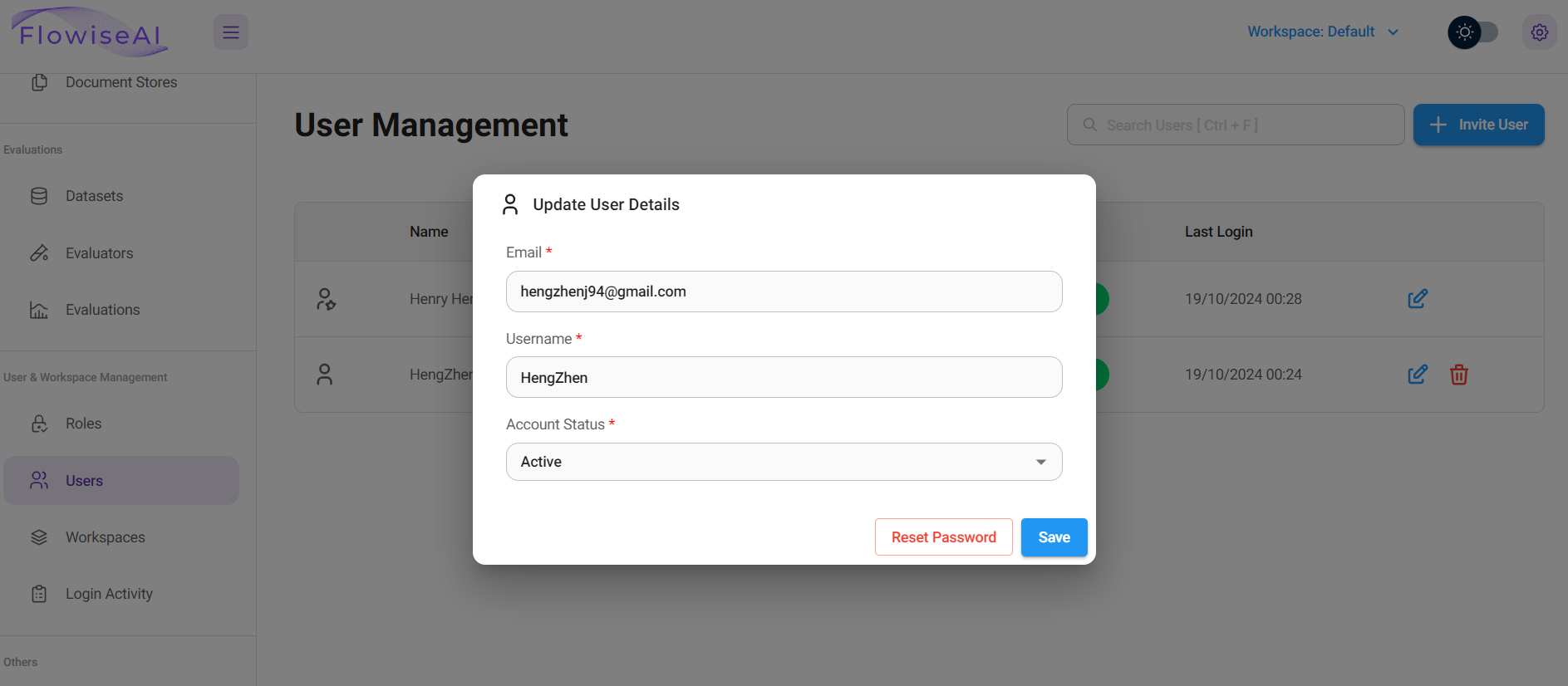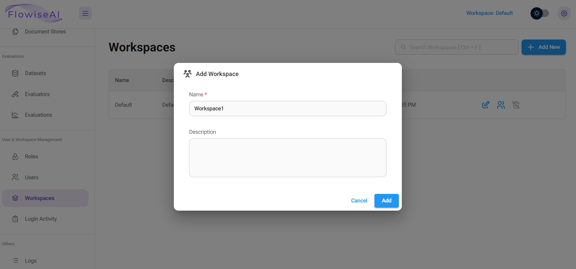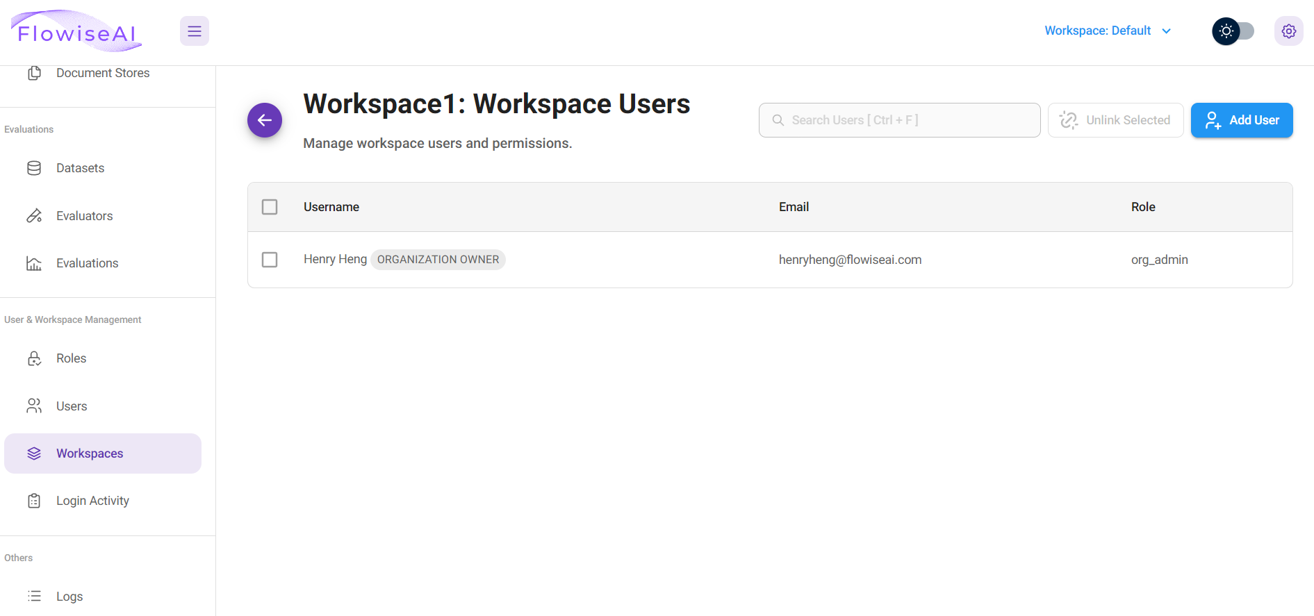 After setting up, user will be brought to Flowise dashboard. From the left side bar, you will see User & Workspace Management section. A default workspace was automatically created.