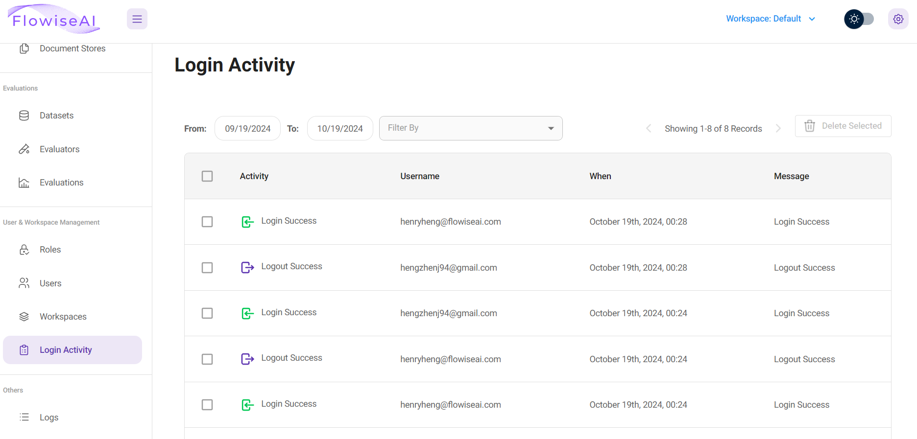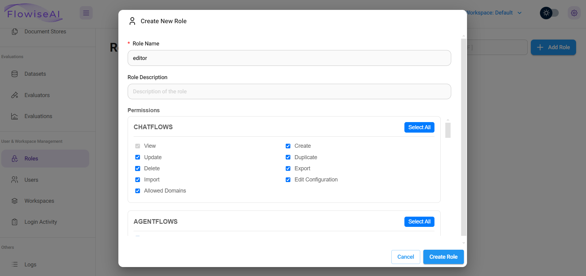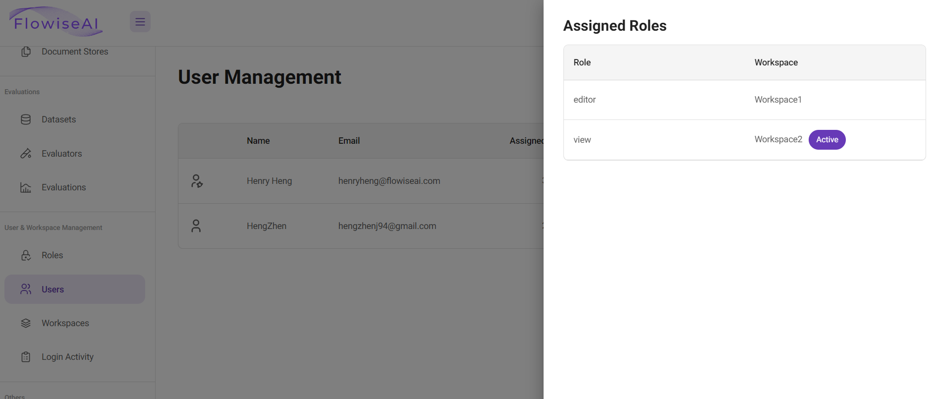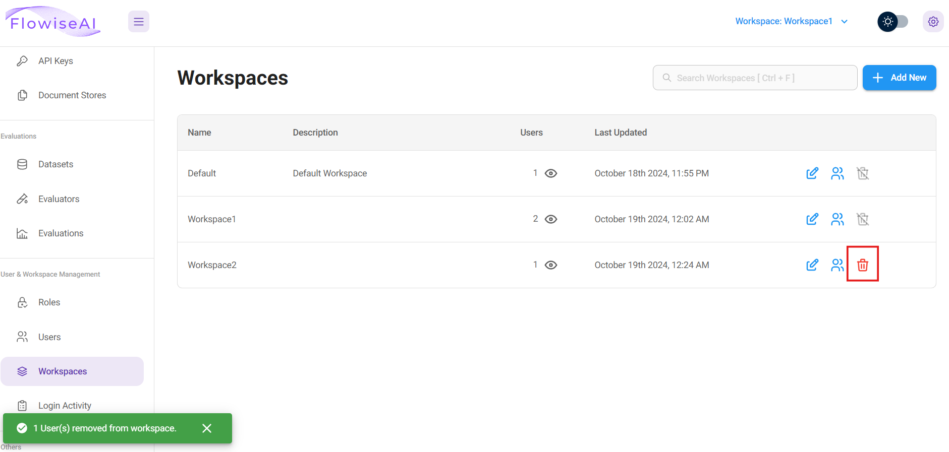 After setting up, user will be brought to Flowise dashboard. From the left side bar, you will see User & Workspace Management section. A default workspace was automatically created.