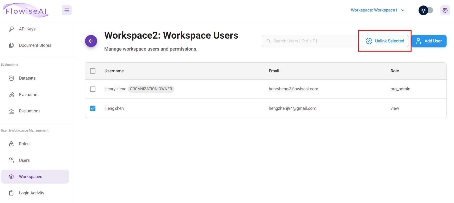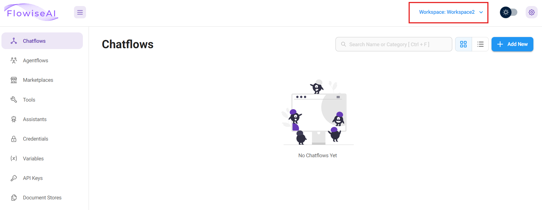 If you are invited into multiple workspaces, you can switch to different workspaces from the top right dropdown button. Here we are assigned to Workspace 2 with view only permission. You can notice the Add New button for Chatflow is no longer visible. This ensure user can only view, not create, update nor delete. The same RBAC rules apply for API as well.