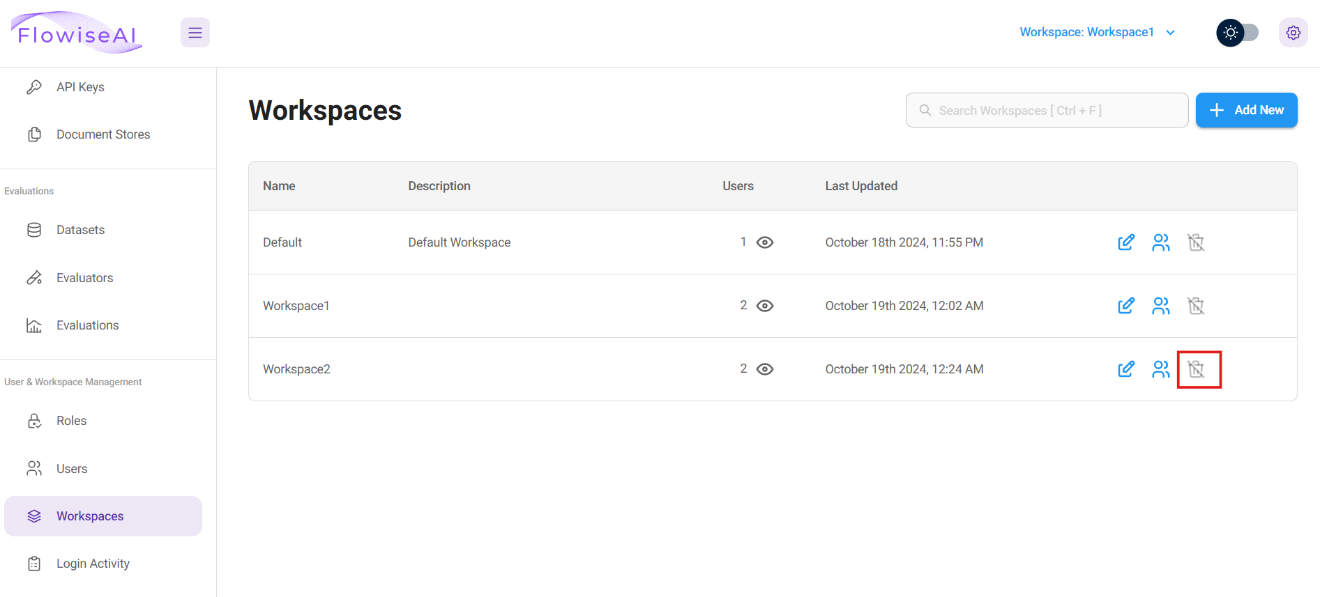 After deleting a workspace, user will fallback to the Default workspace. Default workspace that was automatically created at the start is not able to be deleted.