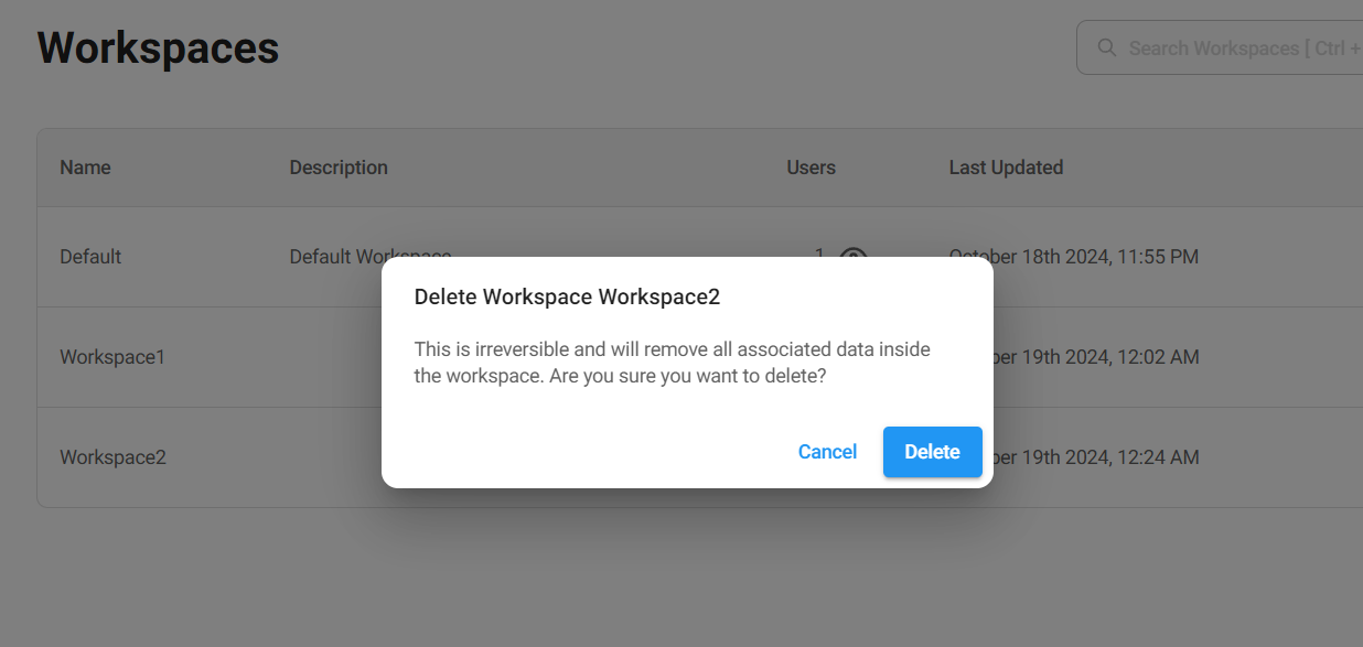Deleting a workspace is an irreversible action and will cascade delete all items within that workspace. You will see a warning box: