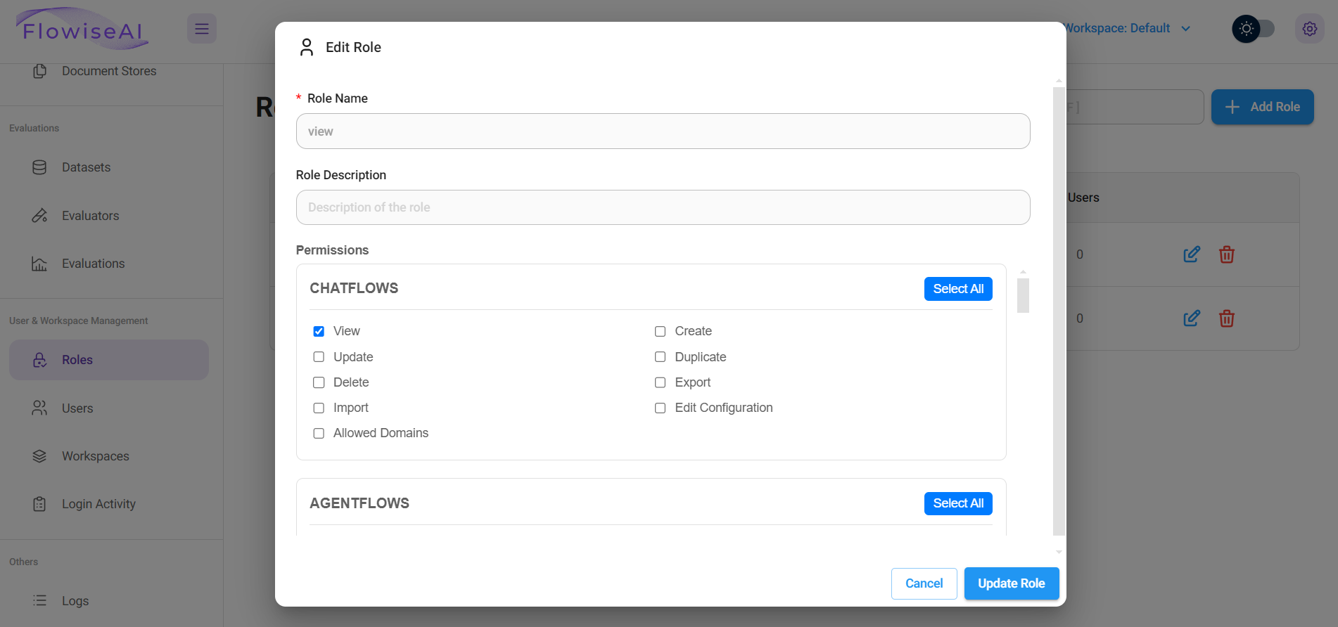 User can specify granular control of permissions for each resources. The only exceptions are the resources in User & Workspace Management (Roles, Users, Workspaces, Login Activity). These are only available for Account Admin for now.