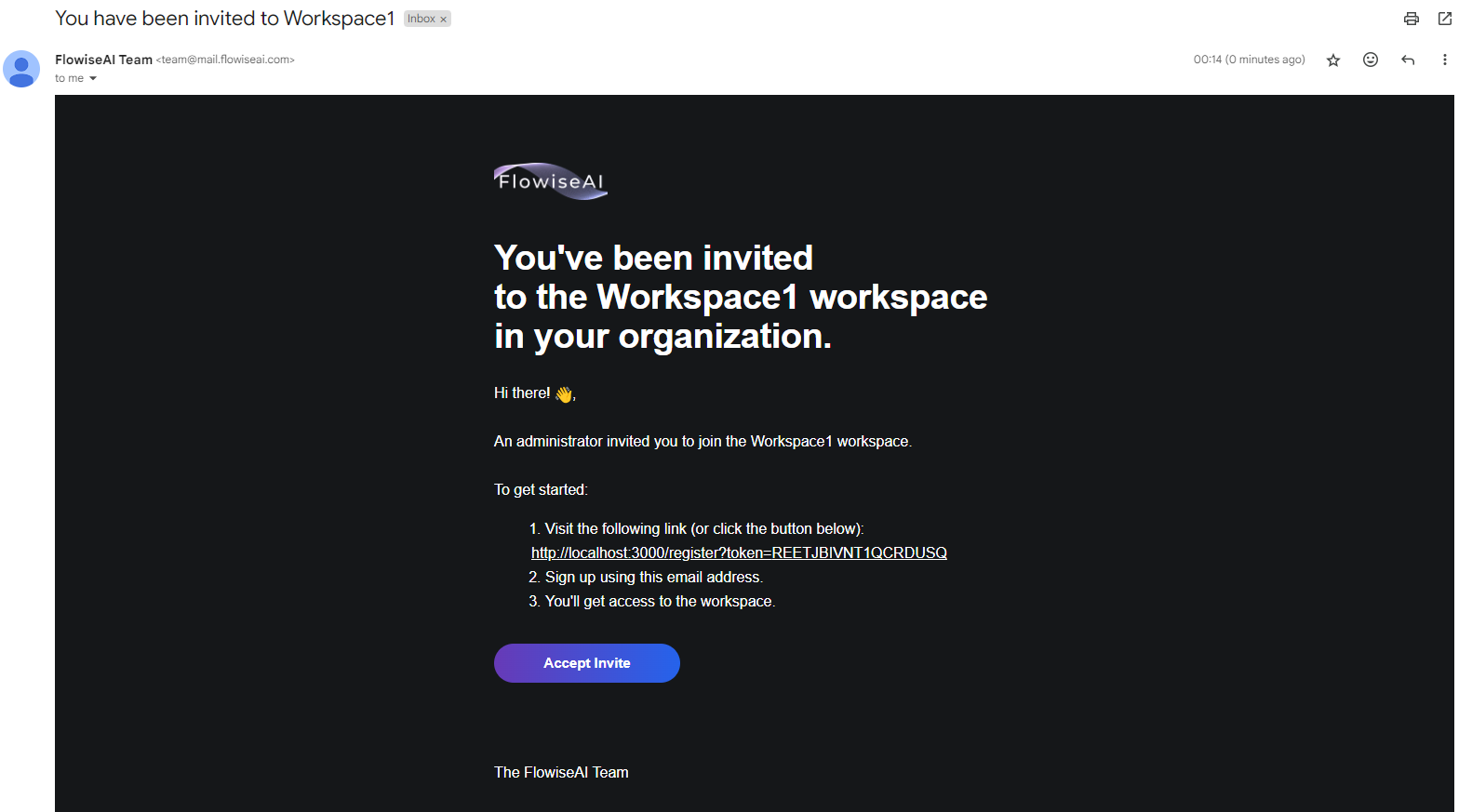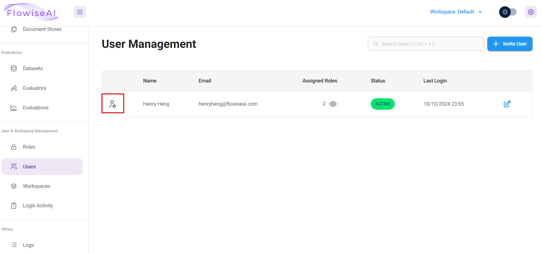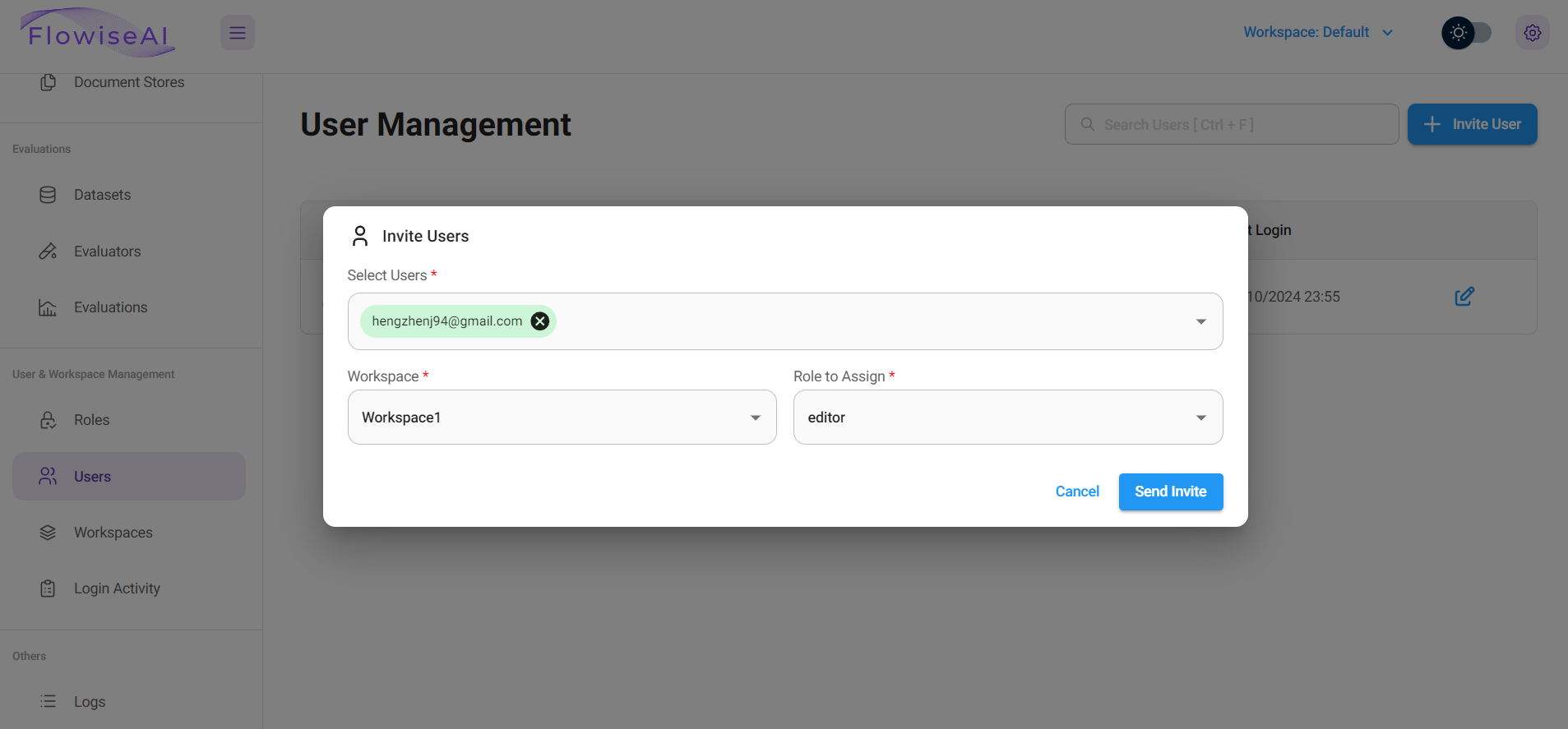 Click Invite User, and enter email to be invited, the workspace to be assigned, and the role as well.